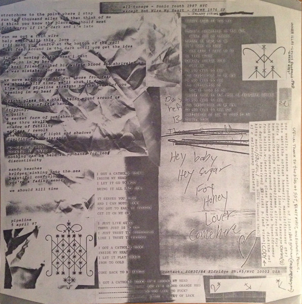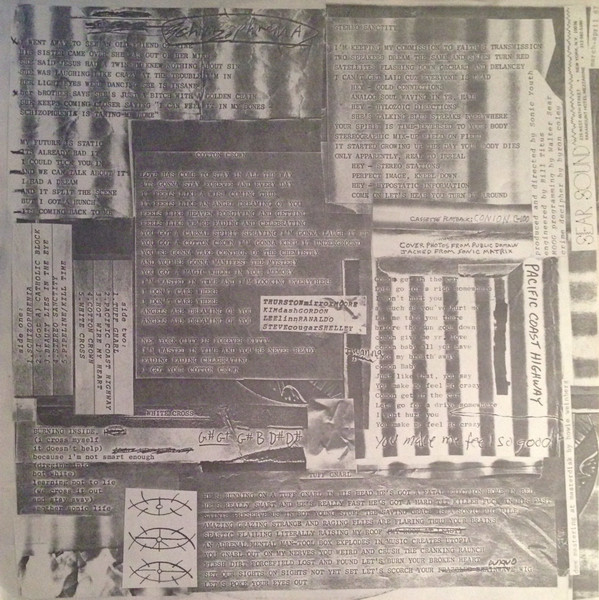direct metal mastering by Howie Weinberg direct metal mastering by [dmm mastering] Howie Weinberg engineer Bill Titus illustration [inner illos] Lucius Shepard performer [sonic youth] Kim Gordon performer [sonic youth] Lee Ranaldo performer [sonic youth] Steve Shelley performer [sonic youth] Thurston Moore photography by [uncredited] Richard Avedon producer, directed by Sonic Youth programmed by [moog] Walter Sear tracks a1 to b2, b4, b5 written-by [all tunage] Sonic Youth Recorded At Sear Sound Copyright (c) Crime Music Copyright (c) Cesstone Music Published By Cesstone Music Phonographic Copyright (p) Crime Music Phonographic Copyright (p) SST Records Mastered At Masterdisk Plated At Sheffield Lab Matrix Pressed By Rainbo Records Pressed By Rainbo Records Original US pressing issued with a lyric insert sheet. Includes Richard Avedon photograph and Disney image on cover.