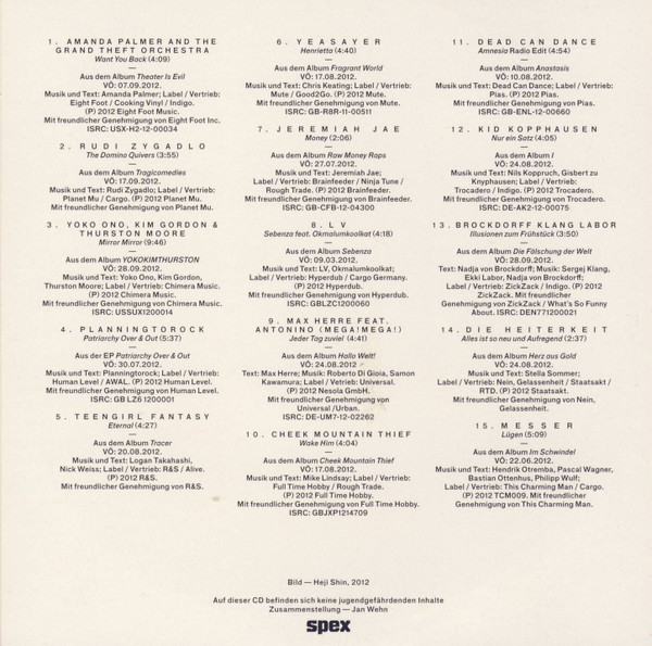 compiled by Jan Wehn photography by Heji Shin Manufactured By Optimal Media GmbH Comes free with the Sep/Oct 2012 issue. Rights Society: Austro Mechana Matrix / Runout: manufactured by optimal media GmbH AC82840-01 Mastering SID Code: ifpi L574 Mould SID Code: IFPI 9742