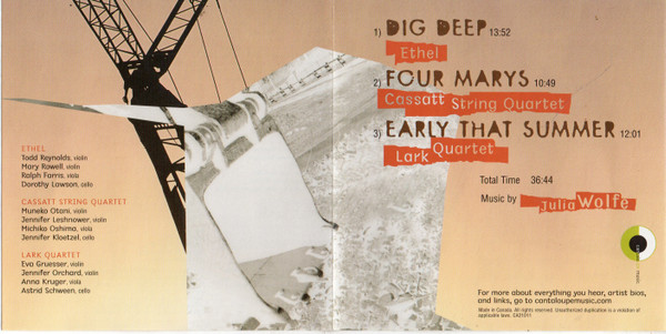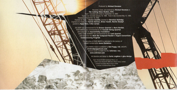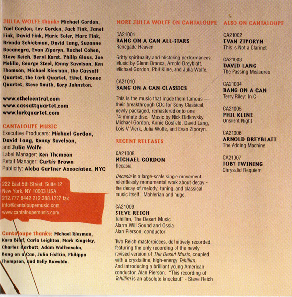art direction, design Carla Leighton composed by Julia Wolfe tracks 2, 3 engineer Brian Fanelli tracks 1 engineer Hector Castillo tracks 2, 3 engineer Martin Stumpf tracks 2, 3 engineer Patrick Derivaz tracks 1 engineer [assistant] Christian Rutledge tracks 2, 3 engineer [assistant] Erika Larsen tracks 2, 3 engineer [assistant] Ryoji Hata music by Julia Wolfe producer, recorded by, mixed by, mastered by Michael Riesman Published By Red Poppy, Ltd. Recorded At The Looking Glass Studios Mixed At The Looking Glass Studios Mastered At The Looking Glass Studios Designed At Gloo Design Manufactured By Cinram Packaged in a clear-tray jewel case with an illustrated 6-panel folded insert that includes credits and release information.
