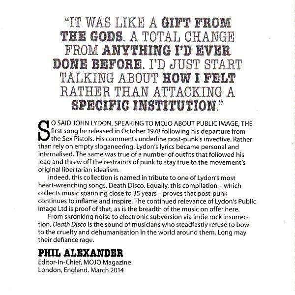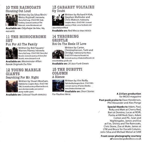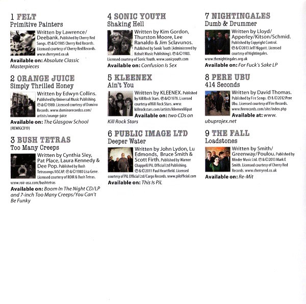 liner notes Phil Alexander Record Company 23 Ears Produced For Mojo Magazine Licensed Through Respect Music (2) Published By Cherry Red Songs Published By Universal Music Publishing Published By Bush Tetrasongs Published By Sonik Tooth Published By Kobalt Music Publishing Published By Warner/Chappell Published By PiL Official Publishing Limited Published By Copyright Control Published By Fire Songs Published By Minder Music Ltd. Published By Complete Music Published By Peer Music Publishing Published By Imagem Music Phonographic Copyright (p) Cherry Red Records (2) Phonographic Copyright (p) Domino Phonographic Copyright (p) Lisa Gene Phonographic Copyright (p) Sonic Youth Phonographic Copyright (p) Paul Heartfield Phonographic Copyright (p) Jeff Higgott Phonographic Copyright (p) Pere Ubu Phonographic Copyright (p) Mark E. Smith Phonographic Copyright (p) Andy Freeberg Phonographic Copyright (p) YMG Phonographic Copyright (p) Mute Phonographic Copyright (p) Industrial Records Ltd. Phonographic Copyright (p) Factory Benelux Copyright (c) Cherry Red Records (2) Copyright (c) Domino Copyright (c) Lisa Gene Copyright (c) Sonic Youth Copyright (c) Paul Heartfield Copyright (c) Jeff Higgott Copyright (c) Pere Ubu Copyright (c) Mark E. Smith Copyright (c) Andy Freeberg Copyright (c) YMG Copyright (c) Mute Copyright (c) Industrial Records Ltd. Copyright (c) Factory Benelux Licensed From Cherry Red Records (2) Licensed From Domino Licensed From ROIR Licensed From Bush Tetras Licensed From Sonic Youth Licensed From PiL Official Publishing Limited Licensed From Cargo Records Licensed From The Nightingales Licensed From Fire Records Licensed From The Raincoats Licensed From Mute Licensed From Industrial Records Ltd. Licensed From Factory Benelux Given away free with MOJO May 2014. Not to be sold separately.