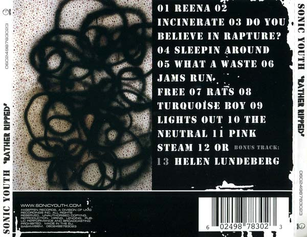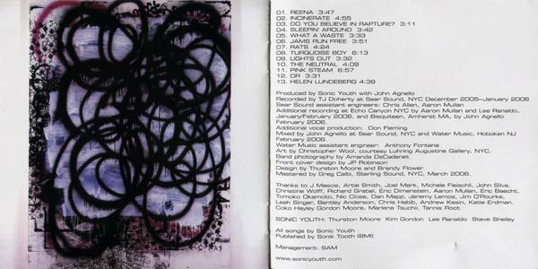 artwork [art by] Christopher Wool design Brandy Flower design Thurston Moore design [front cover design] JP Robinson engineer [sear sound assistant] Aaron Mullan engineer [sear sound assistant] Chris Allen management Silva Artist Management mastered by Greg Calbi mixed by John Agnello mixed by [water music assistant engineer] Anthony Fontana musician [sonic youth:] Kim Gordon musician [sonic youth:] Lee Ranaldo musician [sonic youth:] Steve Shelley musician [sonic youth:] Thurston Moore photography by [band photography] Amanda De Cadenet producer Sonic Youth producer [additional vocal production] Don Fleming producer [with] John Agnello recorded by T.J. Doherty recorded by [additional recording at bisquiteen] John Agnello recorded by [additional recording at echo canyon] Aaron Mullan recorded by [additional recording at echo canyon] Lee Ranaldo songwriter [songs by] Sonic Youth Recorded At Sear Sound Recorded At Echo Canyon (2) Recorded At Bisquiteen Mixed At Sear Sound Mixed At Water Music Recorders Mastered At Sterling Sound Phonographic Copyright (p) Geffen Records Copyright (c) Geffen Records Manufactured By Unknown (GP) Packaged in a jewel case with transparent tray. Booklet: 12 pages