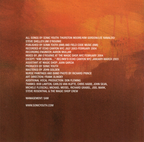 art direction Frank Olinsky bass, vocals Kim Gordon drums Steve Shelley engineer [recording] Aaron Mullan guitar, vocals Lee Ranaldo guitar, vocals Thurston Moore keyboards Jim O'Rourke management Silva Artist Management mastered by John Golden mixed by Jim O'Rourke mixed by [assistant] Juan Bautista Sánchez García painting [nurse paintings], photography by [band photo] Richard Prince producer [additional vocal] Don Fleming producer, written-by Sonic Youth Record Company Universal Music Manufactured By Universal Music & Video Distribution Distributed By Universal Music & Video Distribution Phonographic Copyright (p) Geffen Records, Inc. Copyright (c) Geffen Records, Inc. Published By Sonik Tooth Published By Field Code Music Recorded At Echo Canyon (2) Mixed At The Magic Shop Mixed At Echo Canyon (2) Glass Mastered At Technicolor Universal Media Services Recorded July 2003-February 2004. Mixed February 2004 except Kim Gordon... Rec/Mix'd Echo Canyon NYC January-March 2003.