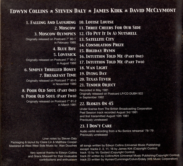artwork [packaging & layout] Matthew Cooper artwork [packaging], layout Claire Lin liner notes Steven Daly mastered by Alan Douches performer [orange juice] David McClymont performer [orange juice] Edwyn Collins performer [orange juice] James Kirk performer [orange juice] Steven Daly tracks 1, 4 to 10, 12 to 17, 19 to 22 written-by Edwyn Collins tracks 2, 3, 11, 18, 22 written-by James Kirk Record Company Domino Recording Co. Ltd. Phonographic Copyright (p) Domino Recording Co. Ltd. Copyright (c) Domino Recording Co. Ltd. Mastered At West West Side Music Published By Universal Music Publishing A compilation of the band's releases on [l6051], also includes previously unreleased tracks.